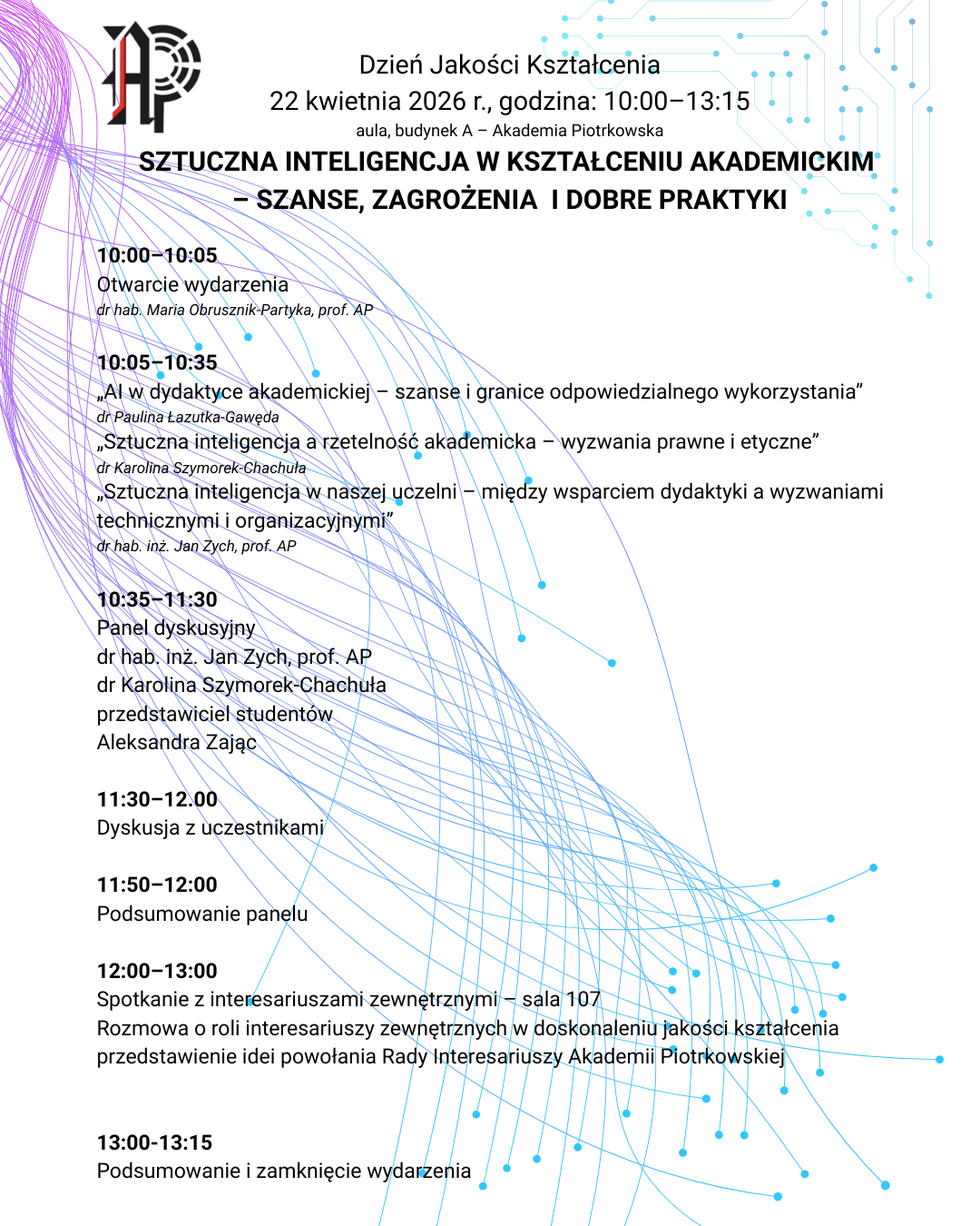 Po części panelowej przewidziano otwartą dyskusję z udziałem studentów, kadry i zaproszonych gości.