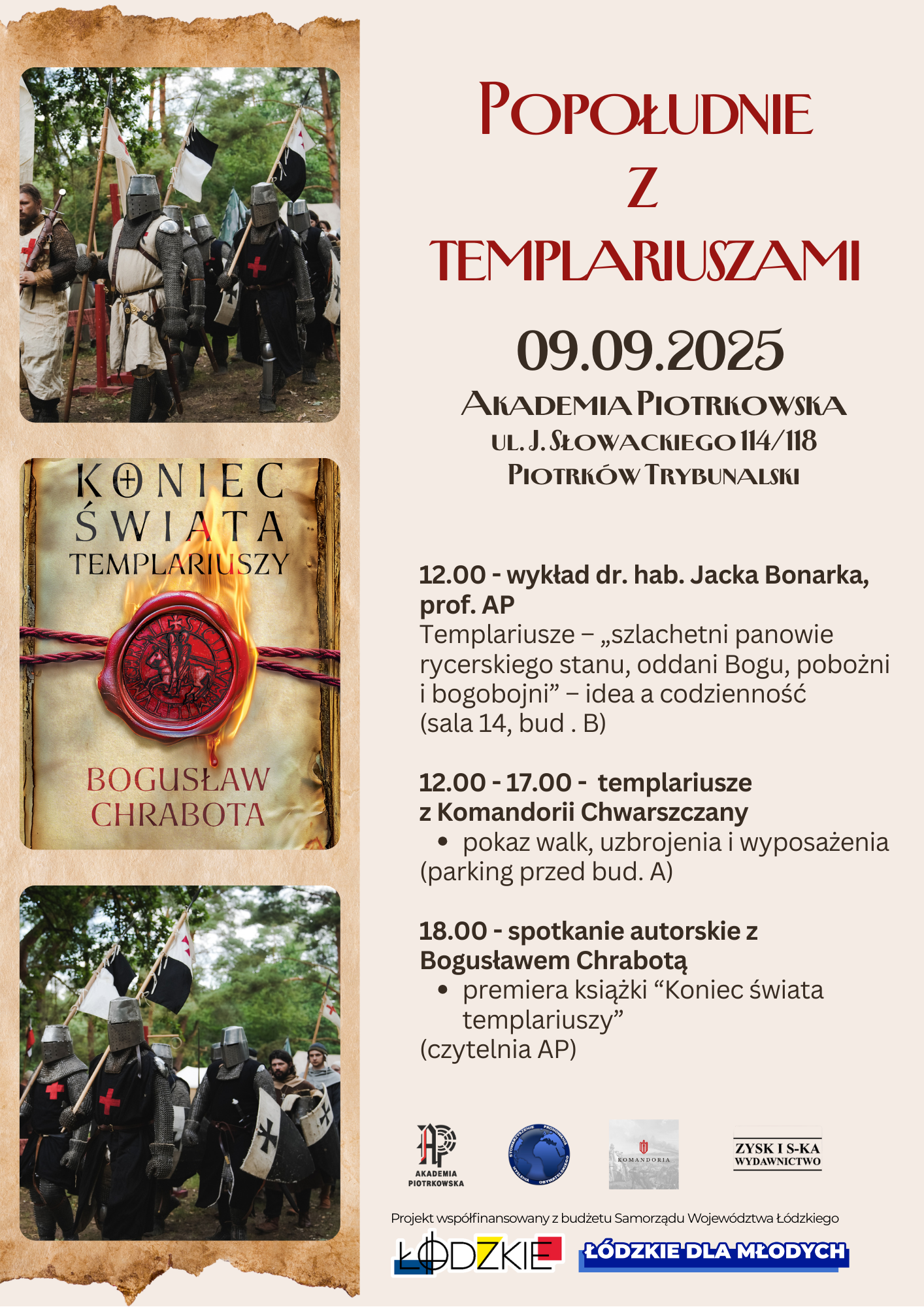 9 września Akademia Piotrkowska stanie się miejscem wyjątkowego wydarzenia. Pojawią się: templariusze, znany autor, który w Piotrkowie Trybunalskim zaprezentuje najnowszą książkę, a o tajemnicach rycerzy opowie rektor naszej uczelni.