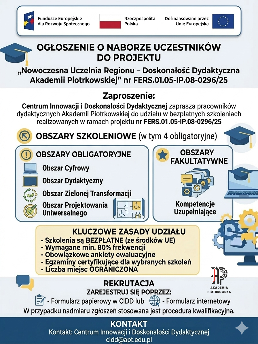 Z ogromną przyjemnością zapraszamy pracowników dydaktycznych oraz badawczo-dydaktycznych Akademii Piotrkowskiej do udziału w bezpłatnym cyklu szkoleń.